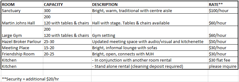 Westdale United Church has rental spaces available for many functions and activities; Weddings, classes, family parties, sports activities, and concerts. Our washroom spaces are beautifully upgraded and fully accessible with a lift. Alcohol is permitted on the premises, however, pre-approval is required. Please click here to view our policy on serving alcohol. We also have kitchen space for refreshments and food.