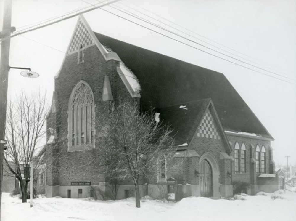 Westdale United Church circa 1944. (Retrieved from the Hamilton Public Library Local History & Archives) Original source: http://preview.hpl.ca:8080/Sites/#1699245691825_10