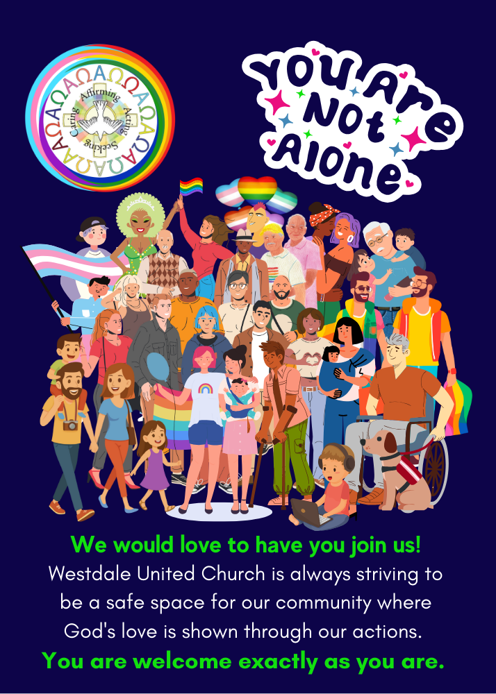 In these challenging times, we want to foster community and ensure that everyone knows that there is a welcoming place for them here at Westdale. In response to the homophobic greeting this new church gave to their neighbors here in our local community, we want to open our doors wider. God’s love is shown through action, and so instead of giving more attention to condemning the specific homophobic/transphobic actions of this new church, we are engaging directly with the community that may have felt targeted, harmed, or unwelcome in their own neighborhood.
